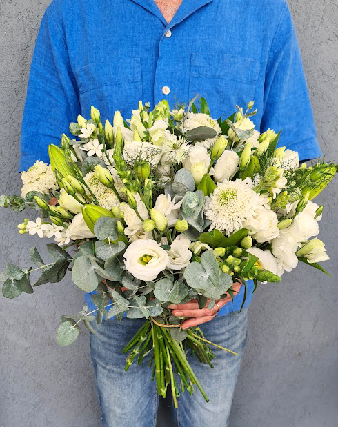 תאור – זר פרחים לבן, חגיגי ומעט פרוע, שלוקח את הקלאסה מעלה אחת ימינה. עם שושן צחור או ליליה לבנה