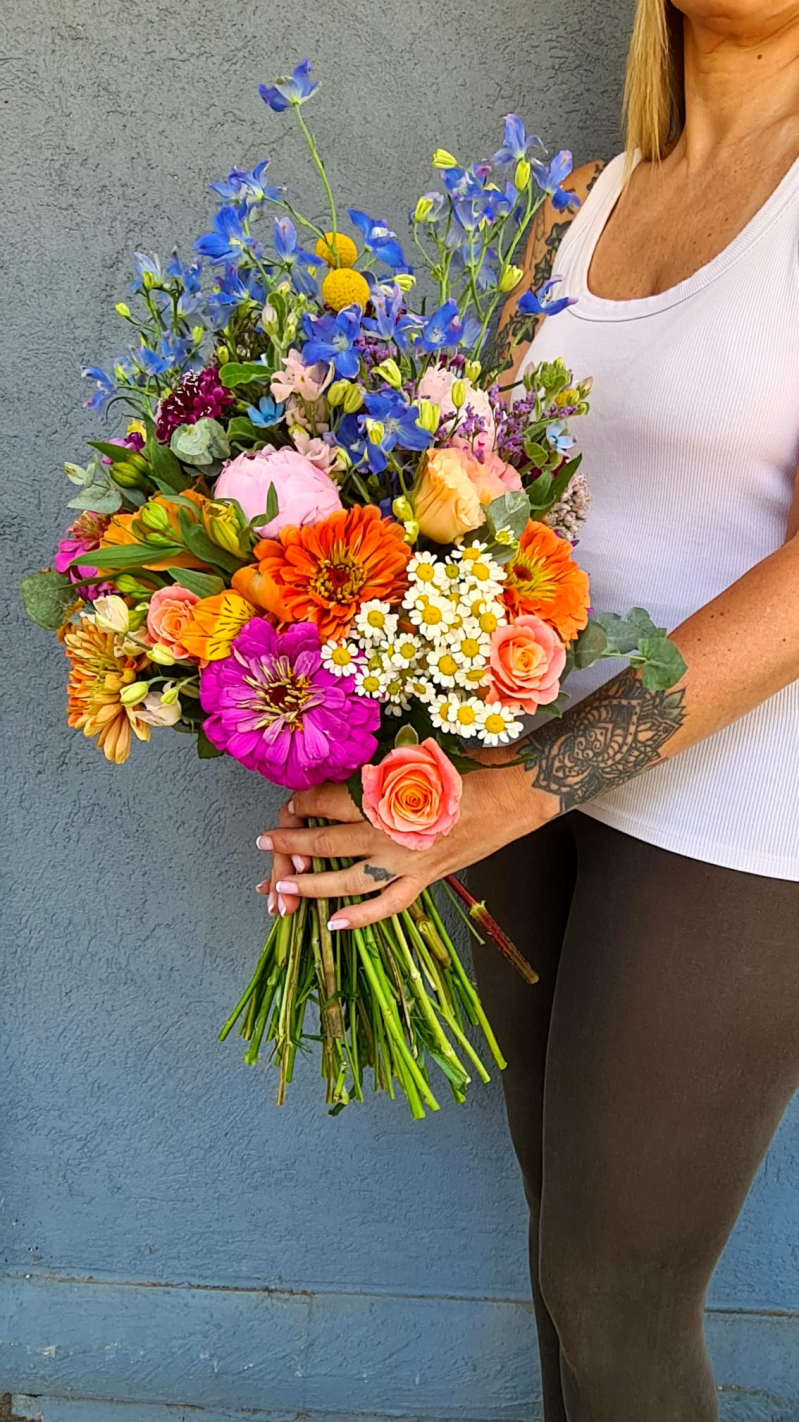 תיאור – זר פרחים אקזוטי במבחר הפרחים ובפלטת הצבעים. מורכב משפע של סוגי פרחי עונה ומשחק גבהים משגע.